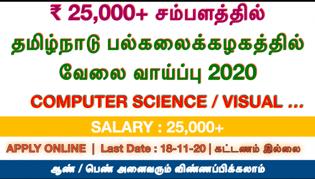 ₹ 25,000 சம்பளத்தில் தமிழ்நாடு பல்கலைக்கழகத்தில் வேலை வாய்ப்பு 2020 5 years ago ₹ 25,000 சம்பளத்தில் தமிழ்நாடு பல்கலைக்கழகத்தில் வேலை வாய்ப்பு 2020 . GUEST FACUTLYகாலிபணியிடங்கள் உள்ளன. APPLY ONLINE /... View Details