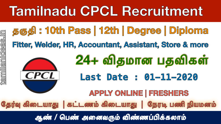 Tamilnadu CPCL Recruitment 2020 in Tamil.Fitter, Welder, Computer Operator, Accountant, HR Executive, Warehouse Incharge, Store Keeper, Food Production and more… காலிபணியிடங்கள் உள்ளன. இந்த வேலைக்கு விண்ணப்பிக்க எந்த கட்டணமும் இல்லை. APPLY ONLINE மூலம் உங்களின் விண்ணப்பங்களை அனுப்ப வேண்டும்