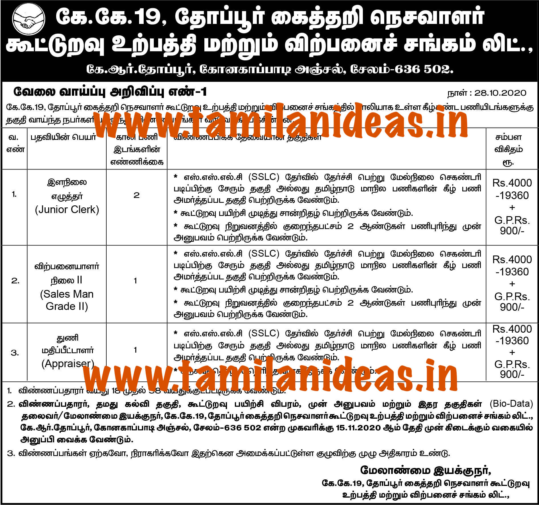 நெசவாளர் கூட்டுறவு சங்க வேலை வாய்ப்பு JUNIOR CLERK | SALESMAN | APPRAISER காலிபணியிடங்கள் உள்ளன. APPLY OFFLINE / மூலம் உங்களின் விண்ணப்பங்களை அனுப்ப வேண்டும்